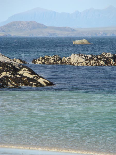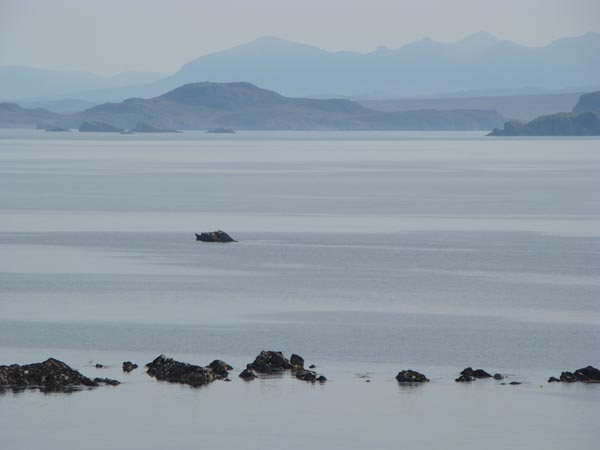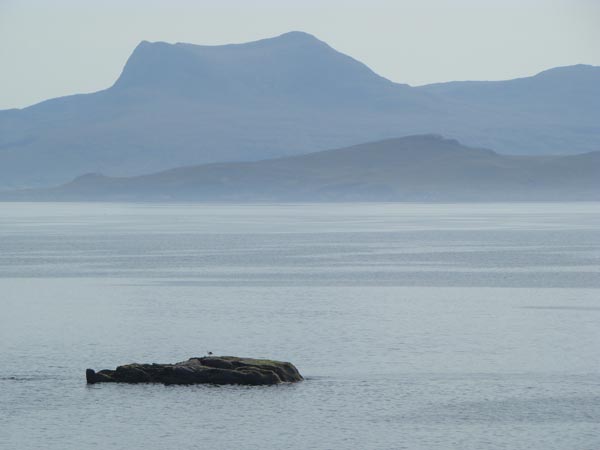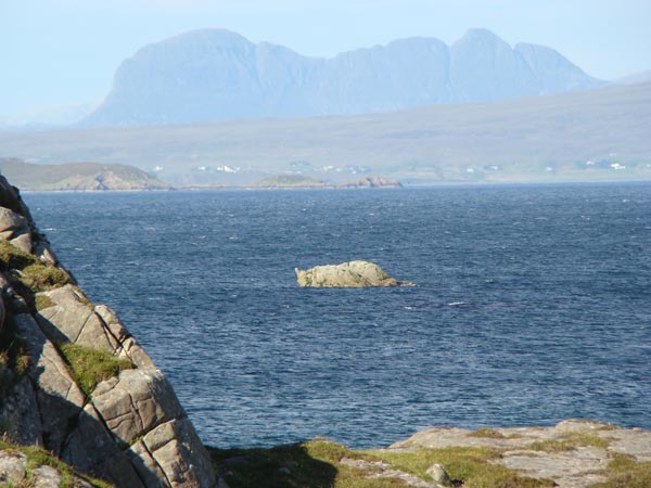 The pictures to the left show, in the distance, some of the high mountains on the west coast of Ross-shire and Sutherland. The picture on the right shows Carramore in the foreground, with the saddle shaped Beinn Goblach (pronounced Ben Golach) in the background, and Gruinard Island in between. This island was the site of anthrax experiments during the Second World War.